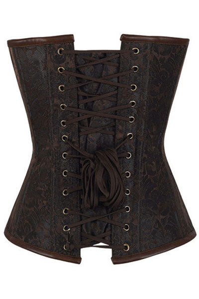 With the help of the authentic steel boning found in the Hourglass Steampunk Chained Overbust Corset, you can rest assured that your corset will last years even with consistent wear. The deep brown brocade with black accents is phenomenal against the chocolate brown faux leather trimming. The brass metal components such as the front opening clasps and the chains really add an additional appeal to the corset that is one of a kind. If you’re looking for a piece that will accentuate all of your best features, this surely is the one to take into consideration. Plus, the 100% cotton lining makes the fabric much more breathable and comfortable. G-string included.