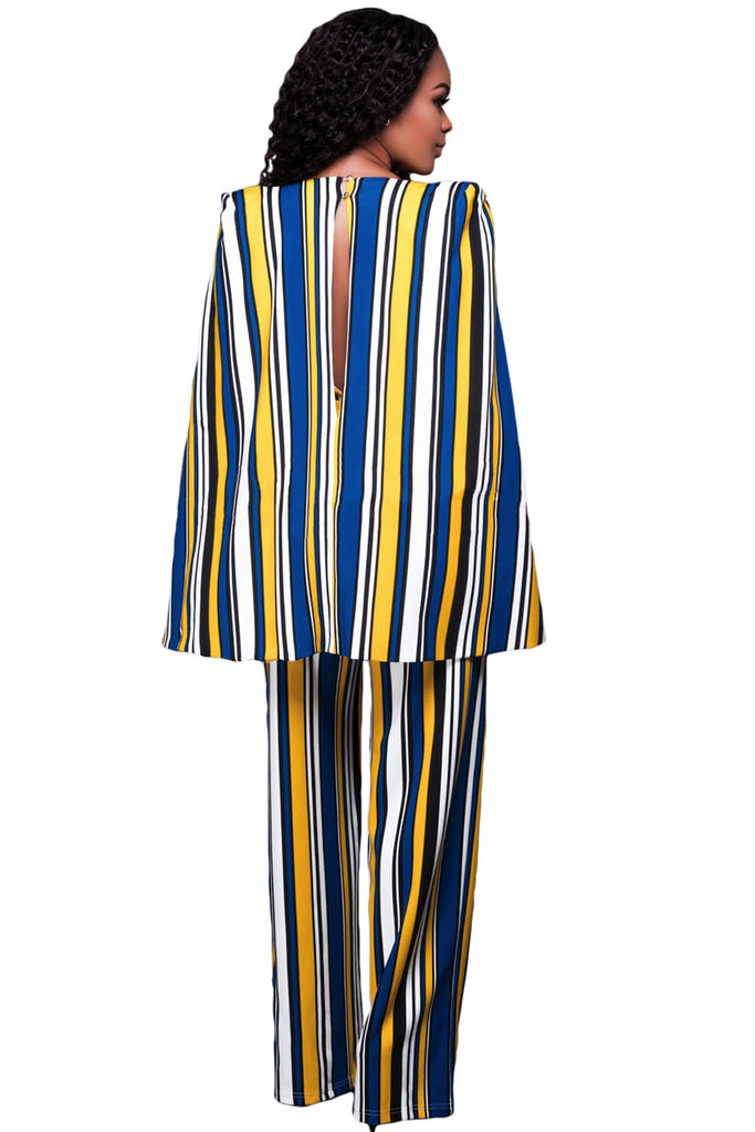 This stripe jumpsuit is a modern occasion essential with its flattering cape design. It's guaranteed to get you noticed with a multicolor stripe body that’s quite chic on trend, sexy V neckline front, shrug shoulder and side pockets on the wide leg pants. Add this outfit a pair of killing high heels will look more perfect.